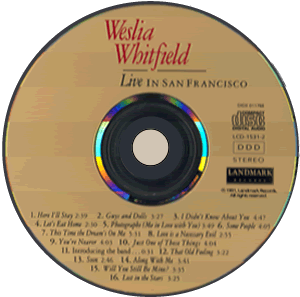 These results make it clear that my guess was a good one. On three spring evenings in 1991, Wesla sang at, for, and with a series of thoroughly captivated audiences, while the tape machines rolled to create this vivid and abundant collection. The repertoire is typical Whitfield, which includes a few genuinely obscure treasures, some lesser-known works of major American composers, and a couple of reinterpretations of songs you might have thought you were tired of. Framing it all are two of the most moving Kurt Weill numbers: the opening Here I'll Stay, and, as an encore, the majestic Lost in the Stars. Between them is Gershwin and Harold Arlen, Rodgers-and-Hart and Duke Ellington and Alec Wilder, there's a Cole Porter (as Wesla explains, that's a necessity) and the very contemporary satirist, Dave Frishberg.